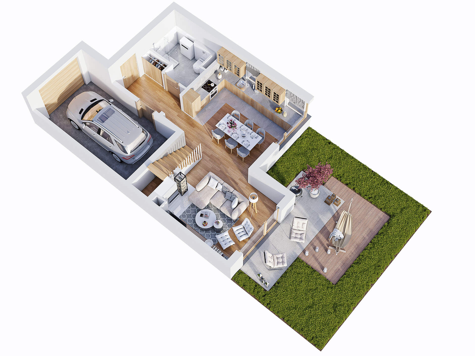 Wygodny garaż w bryle budynku oraz miejsce postojowe przed budynkiem, a przede wszystkim ogród będący naturalnym przedłużeniem przestrzeni domu, zagwarantują Państwu wygodę i odpoczynek którego potrzebujesz.