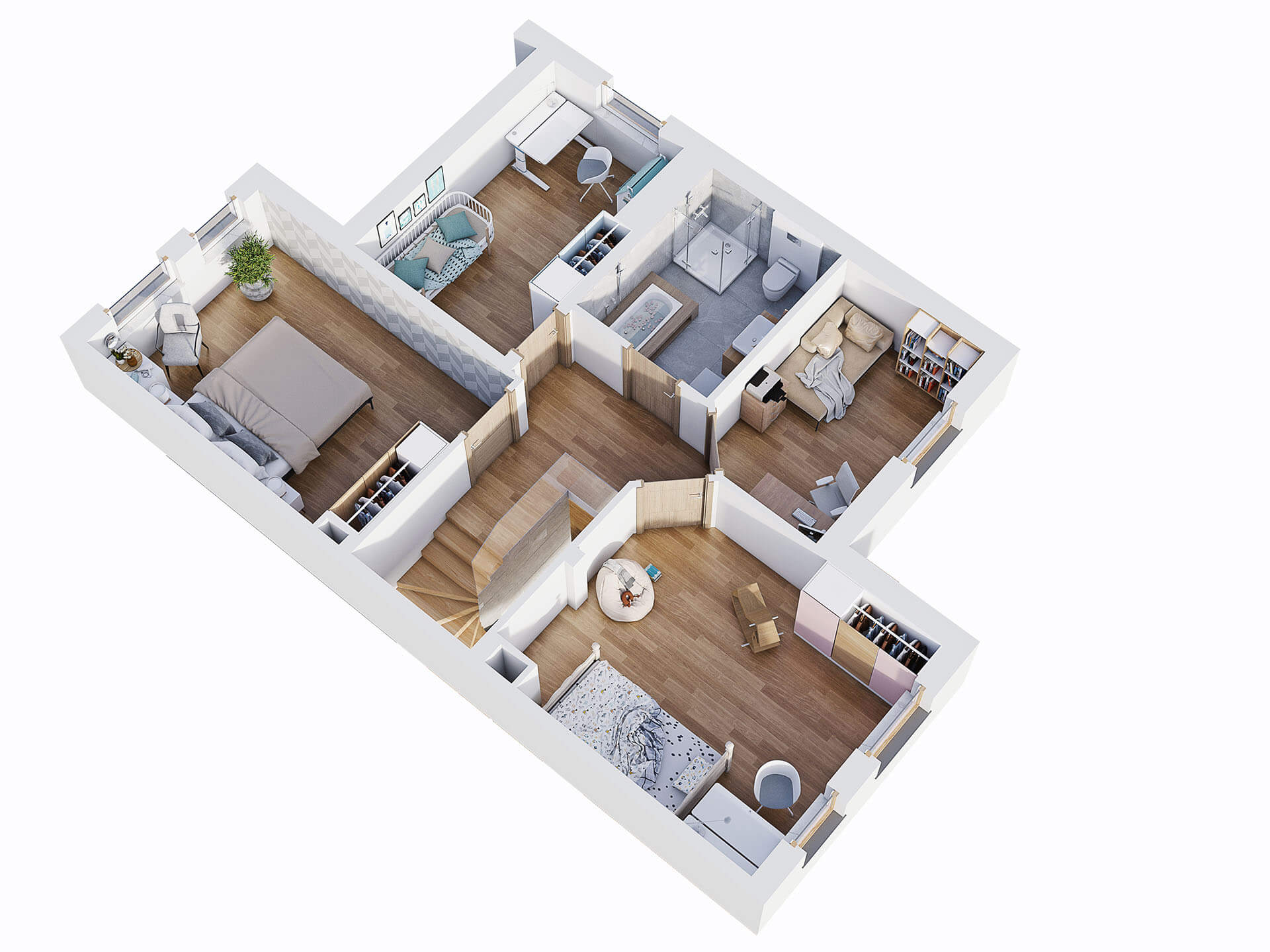 Jeżeli dwie kondygnacje mieszkalne to wciąż niewystarczająca powierzchnia dla Państwa rodziny, istnieje również możliwość adaptacji poddasza np. na sypialnię.